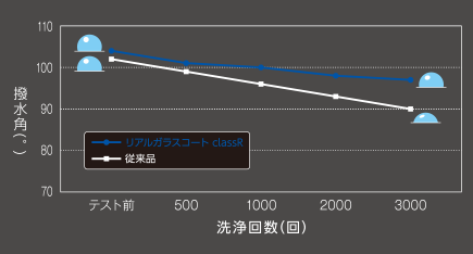 過酷な条件であるアルカリ性洗剤による数千回にも及ぶ洗浄テストでも、リアルガラスコート classRの撥水角の低下は10度未満と、高い耐久性を発揮します。